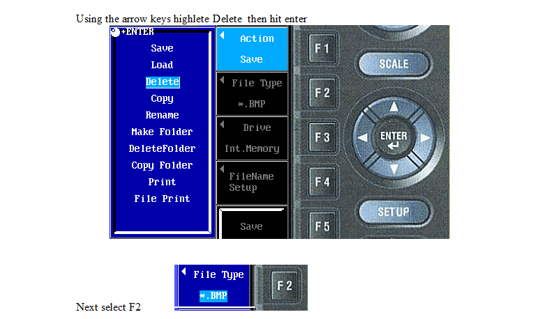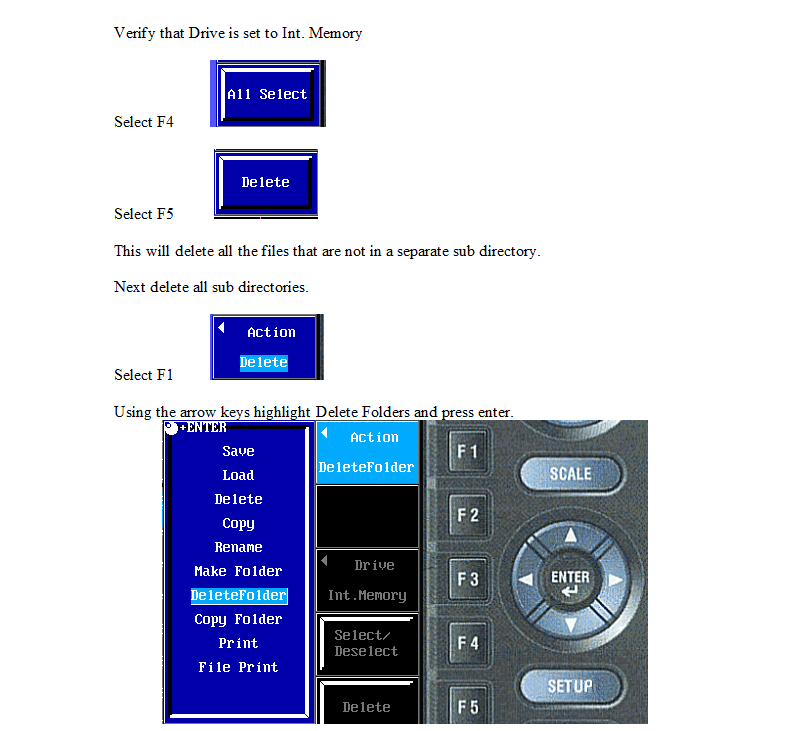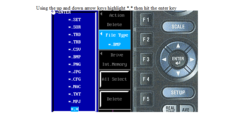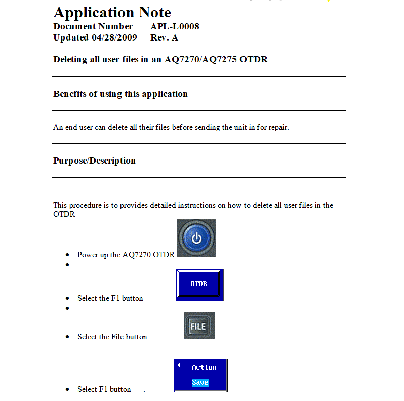 AQ7270 또는 AQ7275 Optical time Domain Reflectormeter (OTDR)의 내부 메모리에서 모든 사용자 파일을 삭제하려면, 아래 절차를 따르세요.