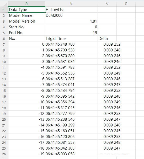 히스토리 리스트에는 레코드 번호, 트리거 발생시각, 그리고 해당 히스토리 파형과 직전 히스토리 파형 간의 트리거 시간 차이가 CSV형식으로 저장됩니다.
