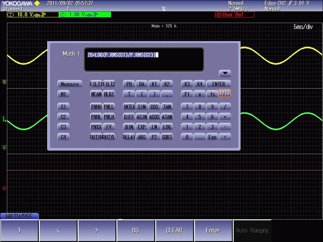 사용자 정의 수학 기능(G2옵션)이 있는 DLM2000 Mixed Signal Oscilloscope에서는 두 전압의 비를 데시벨(dB) 단위로 계산할 수 있습니다.