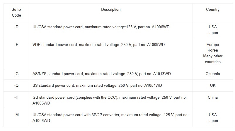 아래와 같이 6가지 종류의 전원 코드 표준을 제공합니다.