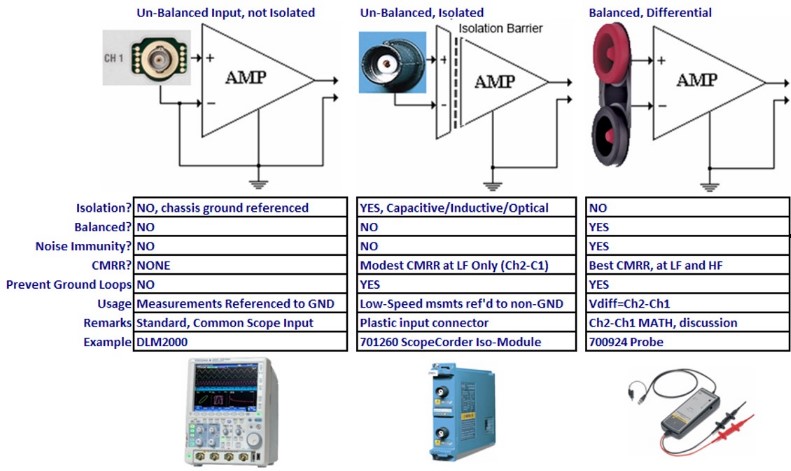불균형, 비절연 입력(오실로스코프)은 단일 종단 증폭기입니다. 이러한 입력은 공통 모드 전압이 매우 작거나 0이고 측정값이 접지(GND)를 기준으로 하는 측정에 적합합니다.