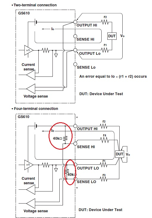 GS 시리즈는 Output 단자를 사용하여 DUT를 공급하고 측정하며, Sense 단자를 측정에 사용하지 않습니다.