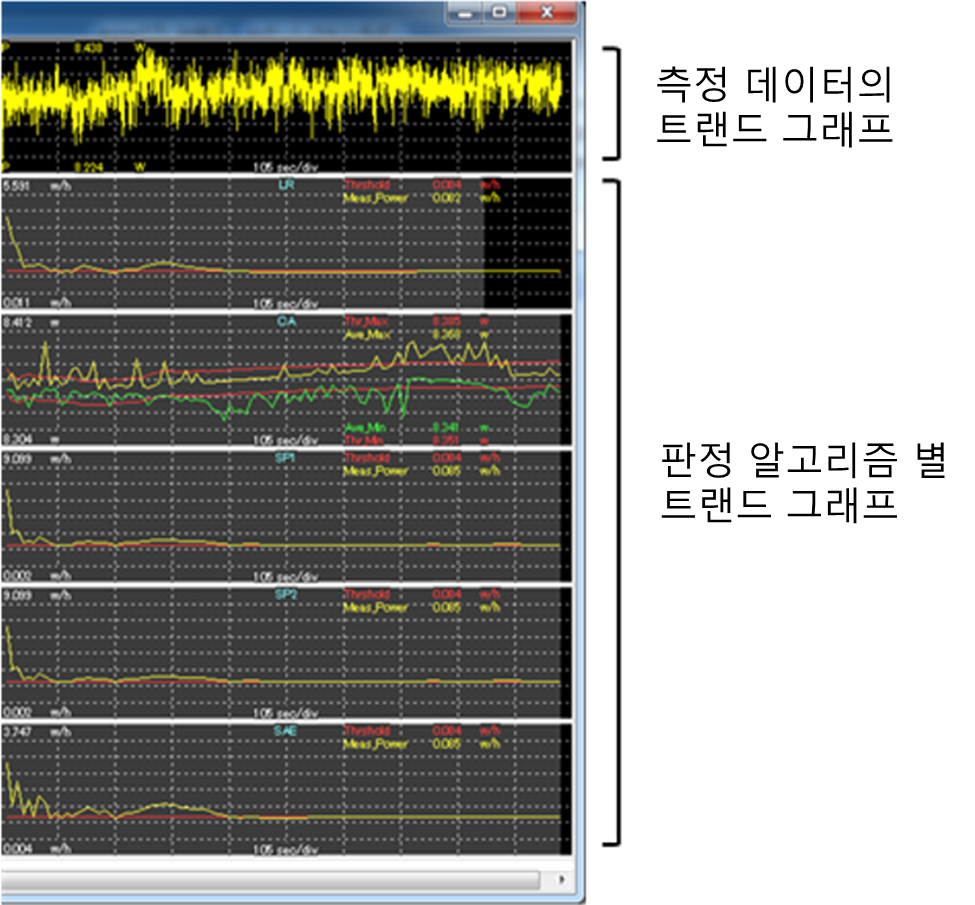 ● IEC62301 Ed2.0 ( Auto ) 설정의 경우에는 측정 화면에 측정 데이터, 판정 데이터의 트렌드 그래프 표시를 할 수 있습니다.