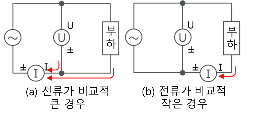 그림 (a) 와 같이 전압 측정 단자를 전류 측정 단자보다 부하측에 접속한 경우, 전류 측정 회로에는 부하에 흐르는 전류와 전압 측정 회로의 입력 저항에 흐르는 전류의 가산 전류가 흐르고, 전류 측정치 오차가 커집니다.
