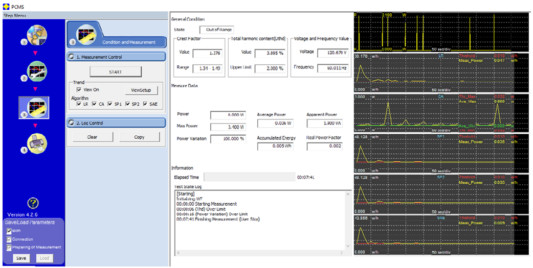 설정 화면 을 통해 사용자는 지역, 표준, 측정 기간 등을 포함한 특정 테스트 요구 사항에 따라 선택할 수 있습니다. 선택한 지역에 따라 정격 전압과 주파수가 결정됩니다. 사용자는 선형 회귀, 누적 평균 및 3섹션 비교 알고리즘을 포함하도록 안정성 판단 알고리즘을 지정할 수도 있습니다.