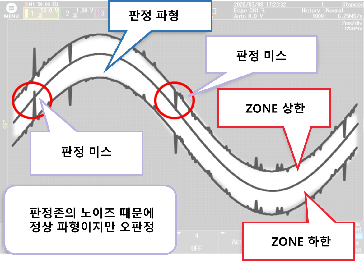 DLM3000/DLM5000 은 캡처한 신호에 대해 파형 존을 사용하여 GO/NO-GO 판정을 실시하고, 이상(또는 정상)의 경우에 데이터 보존, 메일 발신, 알람 발생 등 미리 설정한 액션을 자동 할 수 있습니다. 이상적인 정현파로부터의 어긋남이 어느 범위내에 들어가 있는지 어떤지를 판정하는 경우, 통상은 미리 가능한 깨끗한 정현파 파형을 측정해, 이것을 바탕으로 파형 판정의 존을 작성합니다. 그러나, 신호 발생기, 측정기에 의한 각종 노이즈나 파형의 변형 등을 완전히 배제하는 것이 곤란하기 때문에, 판정 결과에도 영향을 미칠 수 있습니다.